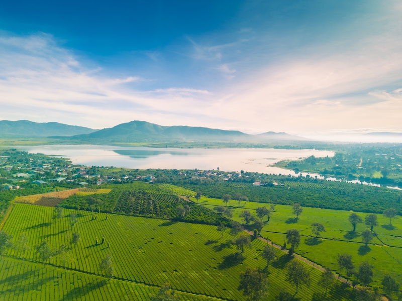 Aerial view of Bien Ho Che or Bien Ho tea fields, Gia Lai province, Vietnam. Workers of the tea farm are harvesting tea leaves in the early morning. Nature landscape, mountain and foggy far away.; Shutterstock ID 2219427513; other: -; purchase_order: -; client: -; job: –